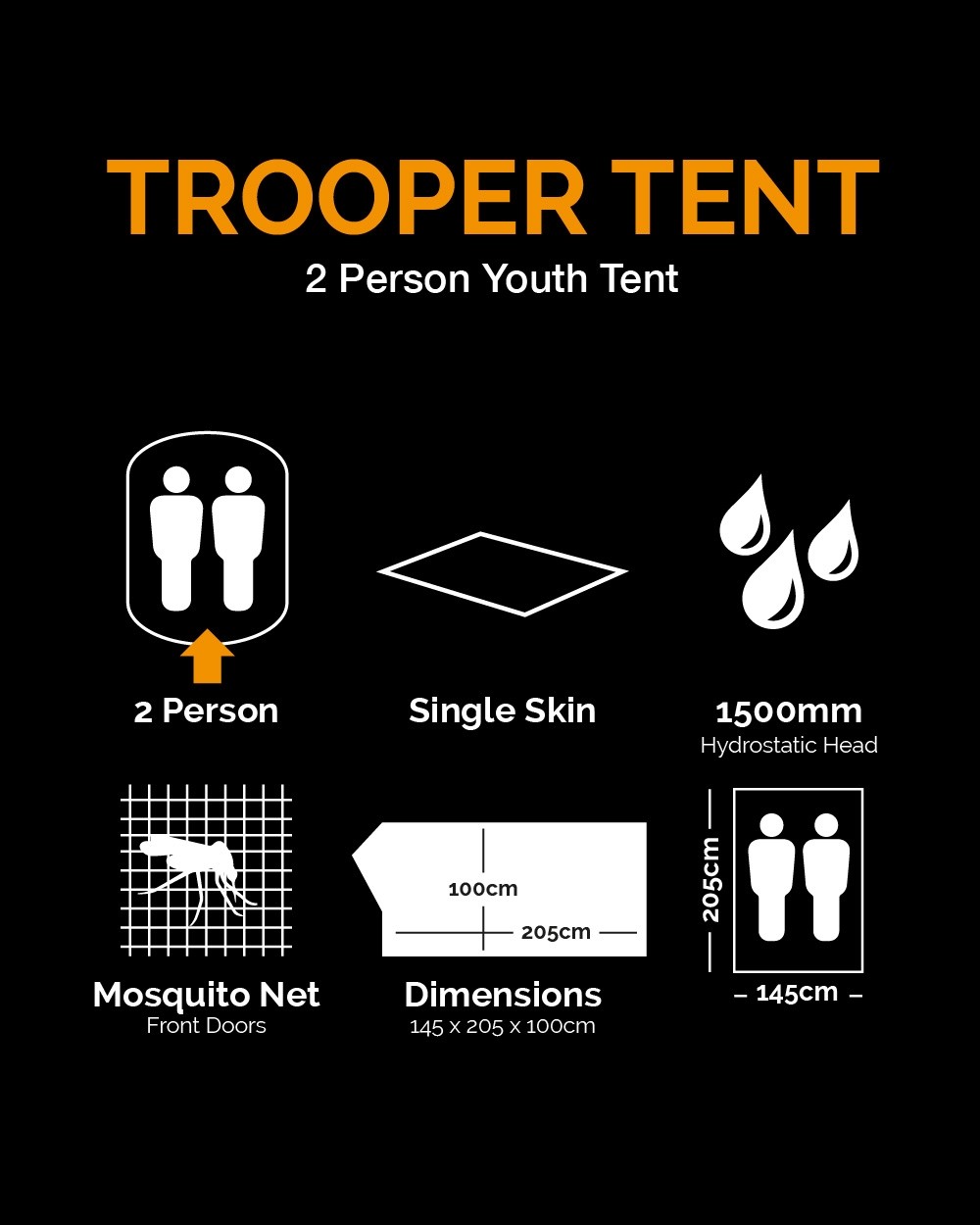 The Trooper Tent is a practical two person youth tent with a single skin which is ideal for expeditions and comfortable camping. It is incredibly light weight and most importantly packs down to a size that won't slow you down.